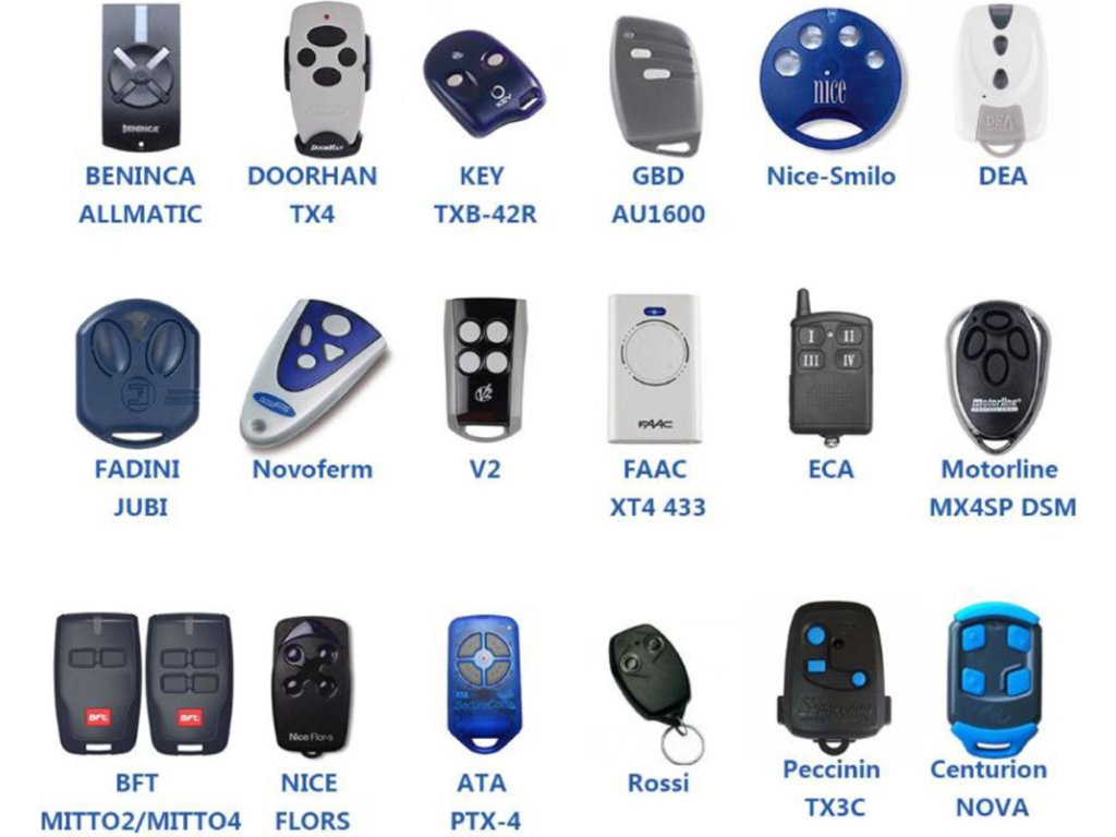 Beninca Allmatic, DoorHan, KEY TXB-42R, GBD AU1600, Nice-Smilo, Nice-Flors, DEA, FADINI JUBI, Novoferm, V2, FAAC XT4, ECA, Motorline MX4SP DSM, BFT MITTO2 / Mitt 4, ATA PTX-4, rossi, Peccinin TX3C, Centurion-NOVA (otváranie garážových brán, pohony vjazdových brán).