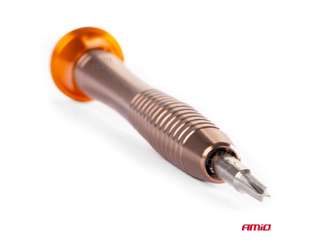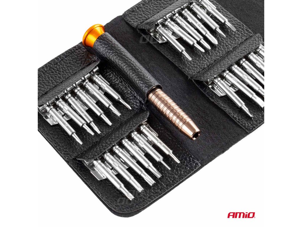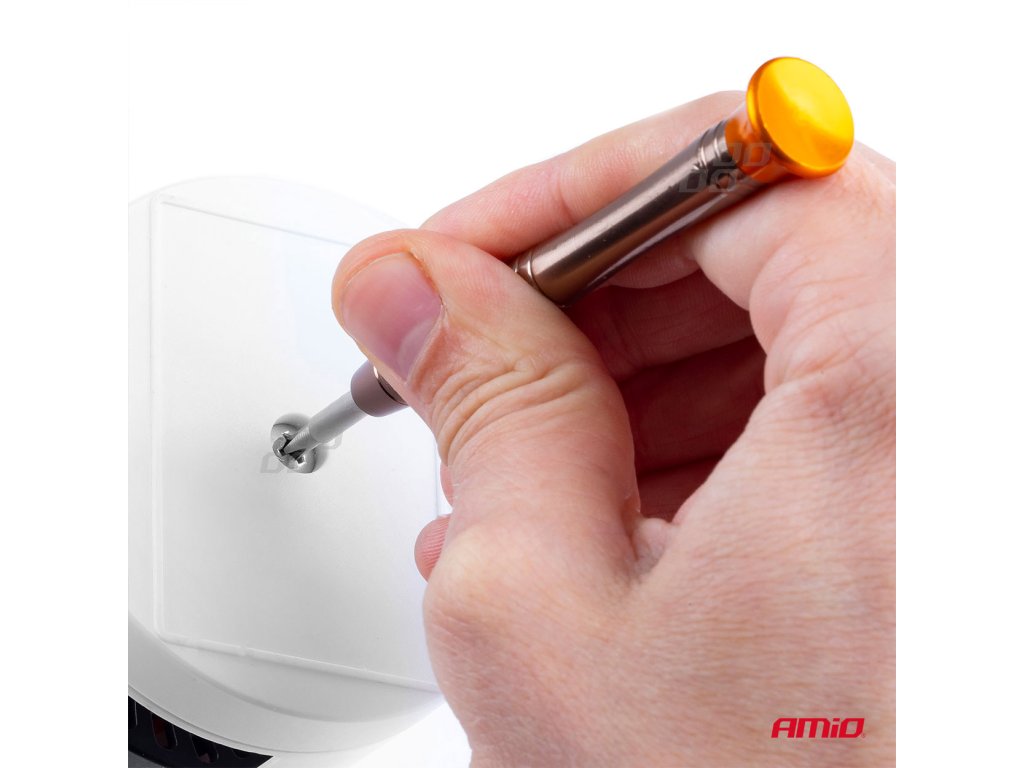 Popis produktu: Sada obsahuje až 24 vymeniteľných bitov na odskrutkovanie skrutiek, všetko zabalené v praktickom úložnom púzdre. S touto sadou presných nástrojov máte 24 skrutkovačov na jednom mieste. TECHNICKé šPECIFIKáCIE •24 presných bitov •Vyrobené z vysoko kvalitných materiálov •Profilovaná, pohodlná rukoväť •Pevné puzdro so zacvakávacím uzáverom •Dĺžka rukoväte: 8,9 cm VýHODY •sada obsahuje až 24 vymeniteľných skrutkovacích bitov, rôzne typy skrutkovačov zaisťujú prispôsobenie rôznym hlavám skrutiek •univerzálna sada náradia, pre domáce a komerčné použitie, vhodná pre profesionálov zaoberajúcich sa napr. elektromechatronikou a na drobné domáce opravy •praktické púzdro, sada opravárenských nástrojov v elegantnom koženom púzdre •bezpečné uloženie, každý bit je zasunutý do kovového pántu a puzdro sa uzatvára pevnou západkou •pohodlné a praktické použitie, profilovaná rukoväť s drážkovanými drážkami nám poskytuje výnimočne jednoduchú a rýchlu prácu •bity z nehrdzavejúcej ocele, pevný materiál chráni presné nástroje pred koróziou, nečistotami a poškodením •Skvelý tip na darček, sada skrutkovačov bude praktickým darčekom pre každého muža. SET OBSAHUJE •24 vymeniteľných bitov •1 montážna rukoväť •púzdro SADA PRESNýCH SKRUTKOVAČOV šIROKá šKáLA POUŽITIA Súpravu je možné použiť na opravu telefónov, smartfónov, notebookov a ďalších. Skvele sa hodí aj na drobné domáce opravy JEDNODUCHé ODSTRáNENIE KOMPONENTOV Každý z bitov je pripevnený na špeciálnej rukoväti, ktorá zabraňuje ich vypadnutiu. OBSAHUJE AŽ 24 VYMENITEĽNýCH KOMPONENTOV Umožnia vám použiť správny skrutkovač takmer v každej situácii. JEDNODUCHé UCHOVáVANIE Vďaka praktickému puzdru 24 VYMENITEĽNýCH BITOV PRE šPECIáLNE úLOHY + RúČKA 24 rôznych bitov + rukoväť Balenie: zatváracie púzdro Krížové skrutkovače: 1,0 1,2 1,5 2,0 2,5 3,0 Ploché skrutkovače: 1,0 1,5 2,0 2,6 3,0 Torx skrutkovače: T2 T3 T4 T5 T6 T8 T10 Päťhviezdičkové skrutkovače: 0,8 1,2 Y skrutkovače: 0,6 2,0 Trojuholníkový skrutkovač: 2.3 Bodový skrutkovač JEDNODUCHé POUŽíVANIE A PRAKTICKé POUŽITIE Sada obsahuje univerzálny držiak, na konci ktorého sú namontované vymeniteľné bity. Všetko, čo musíte urobiť, je upevniť príslušný bit do rukoväte.
