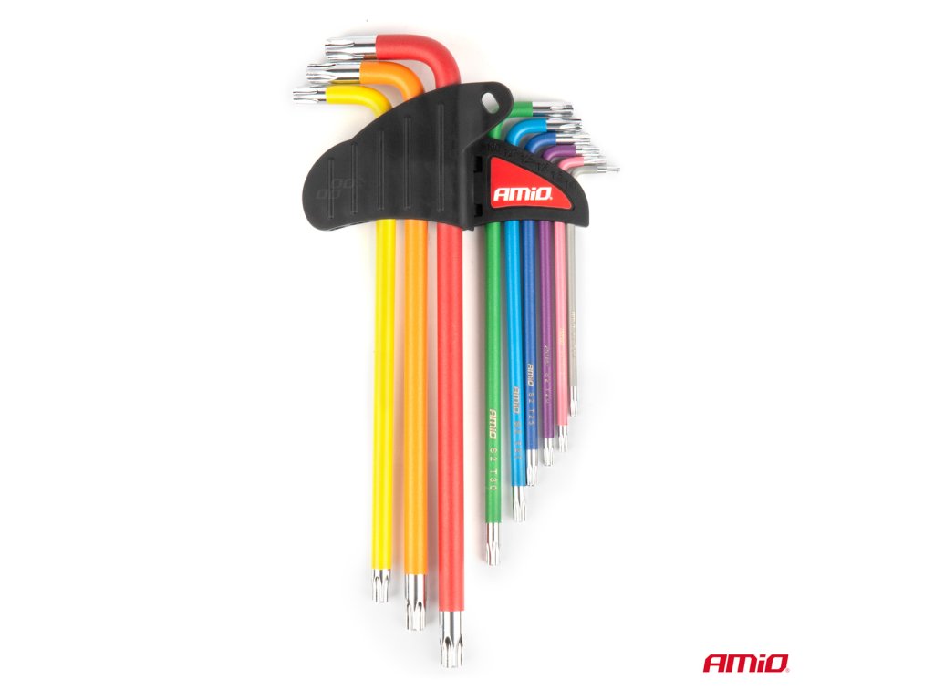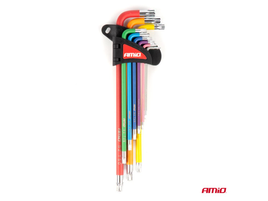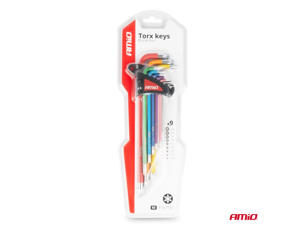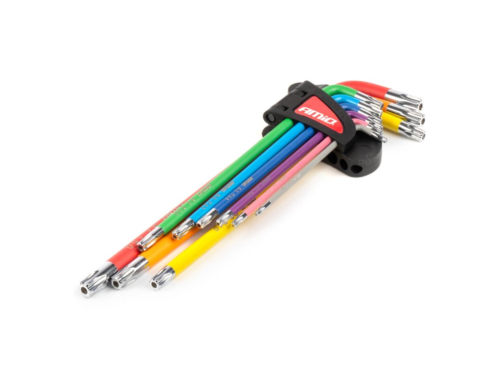 Zestaw kluczyTORX extra długich 9 szt. Materiał: S2 Rozmiary: T10.T15,T20,T25,T27,T30,T40,T45,T50 Długość max: 230mm