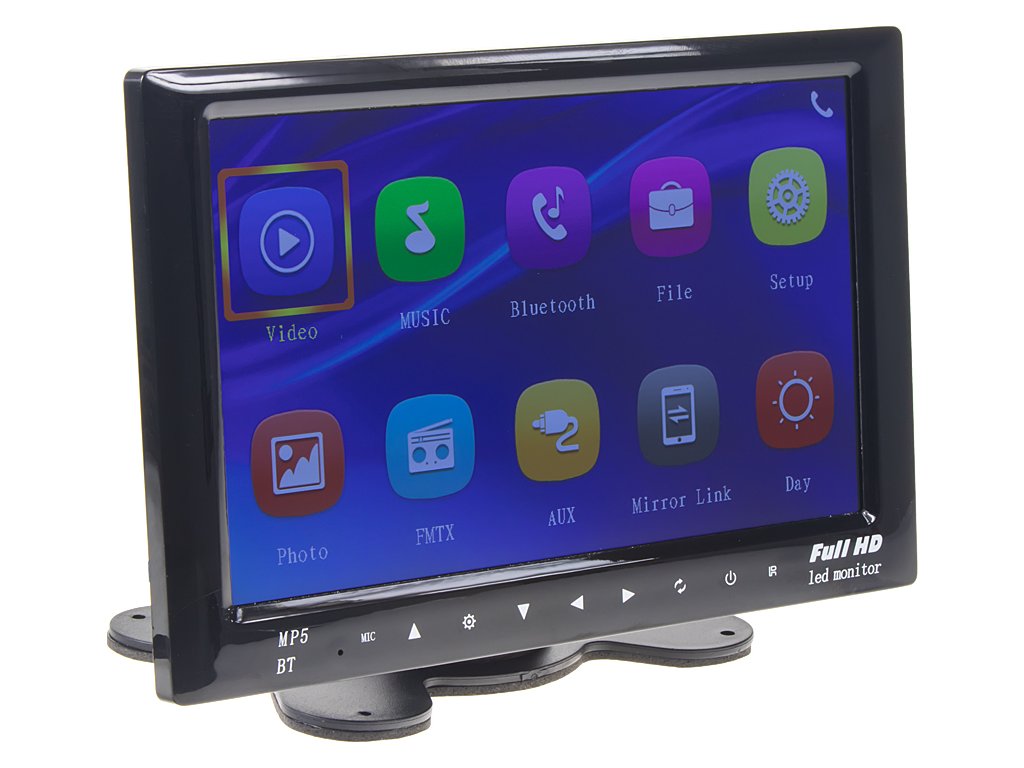 Kvalitný LCD monitor 7 "určený na montáž na palubnú dosku, s čítačkou microSD kariet, USB portom (možnosť prehrávania súborov: video, hudobné, fotografie, elektronická kniha) so zobrazením 16: 9, FM modulátorom a Bluetooth pripojením s možnosťou využitia ako Bluetooth handsfree alebo ako prehrávača.