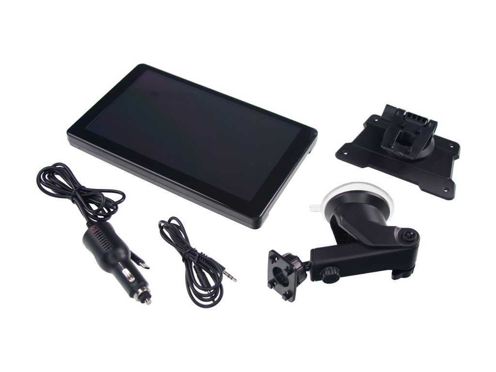 Obsah balenia: Monitor, držiak s prísavkou, držiak na pevnú montáž, napájací kábel s CL koncovkou, AUX kábel.