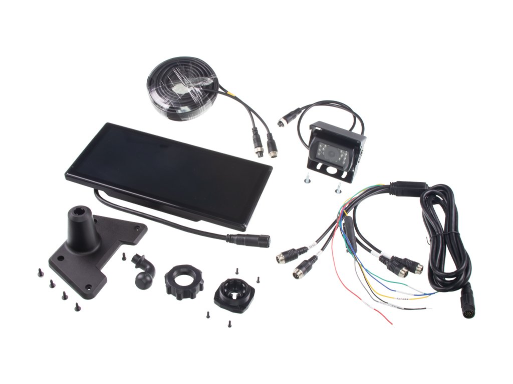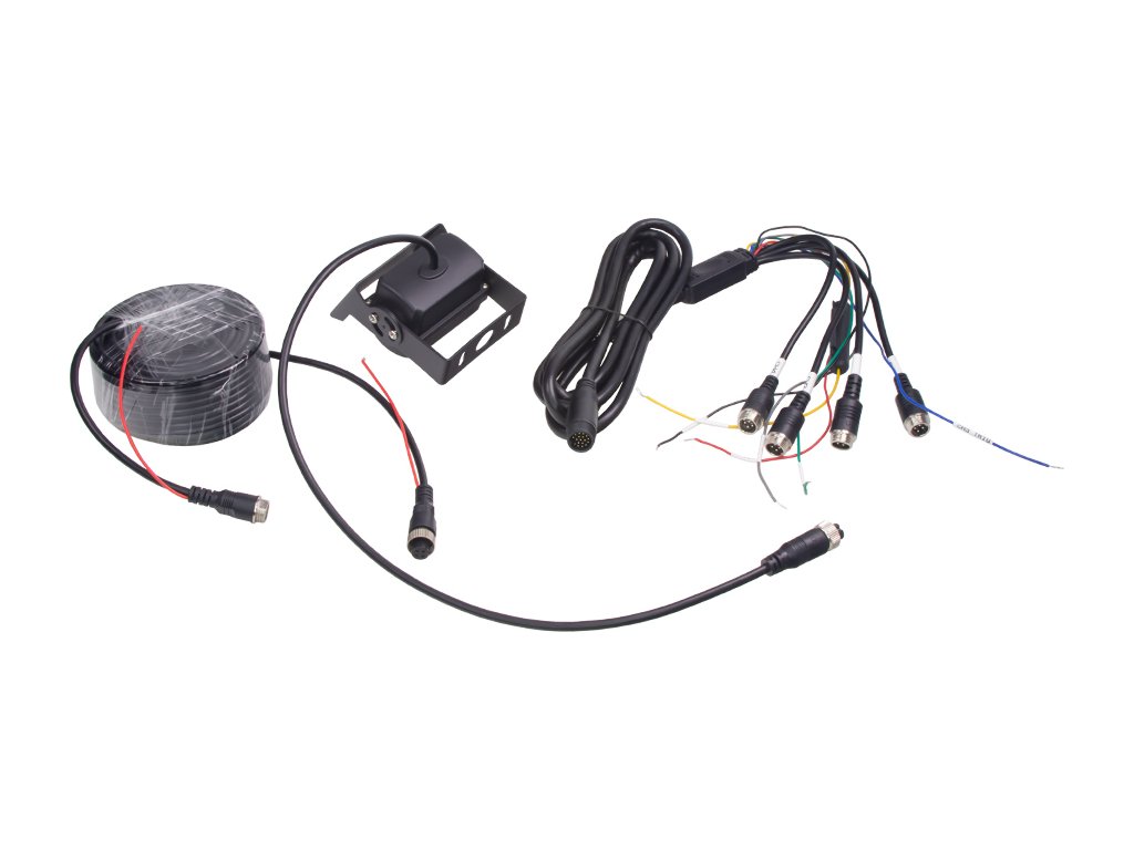Obsah balenia: Monitor, držiak na pevnú montáž + obojstranná páska, napájací kábel pre pripojenie kamery na palubné napätie (ACC+BAT), zadná 4PIN kamera+ 4PIN 15m prepojovací kábel.
