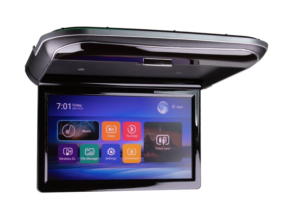 Kvalitný plochý stropný výklopný LED LCD monitor 11,6" s OS. Android, HDMI vstupom, čítačkou USB so zobrazením 16:9, dekoratívne osvetlenie (multicolor).