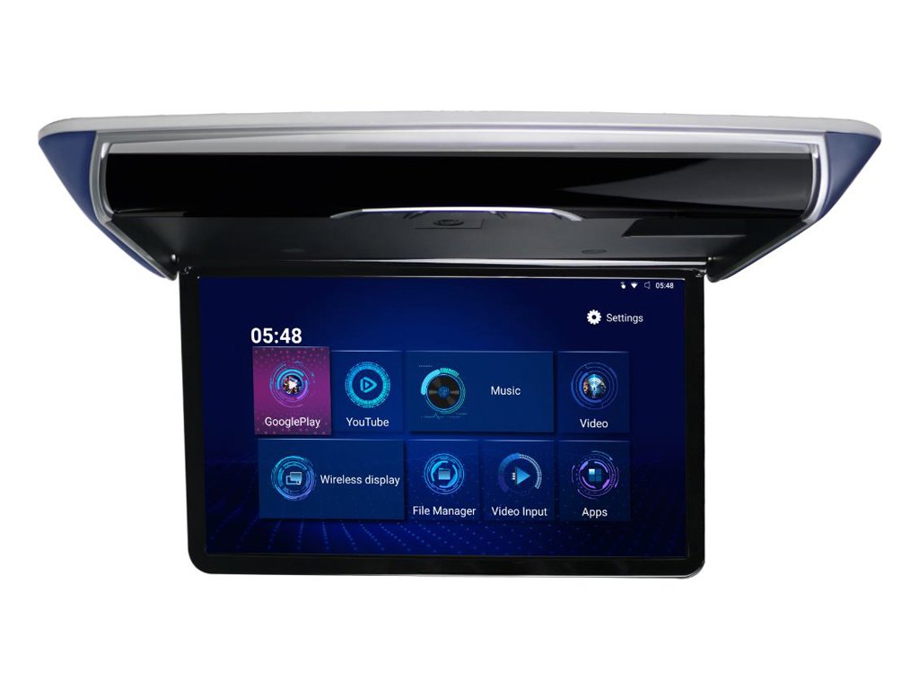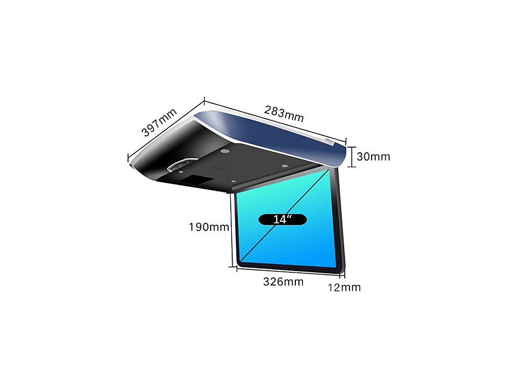 Kvalitný plochý stropný výklopný LED LCD monitor 14" s OS. Android, HDMI vstupom, čítačkou USB/SD so zobrazením 16:9, dekoratívne osvetlenie (multicolor).