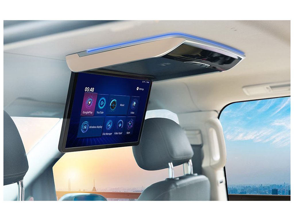 Kvalitný plochý stropné motoricky výklopný LED LCD monitor 15,6 "s OS. Android, HDMI vstupom, čítačkou USB / SD so zobrazením 16: 9, dekoratívne osvetlenie (multicolor).