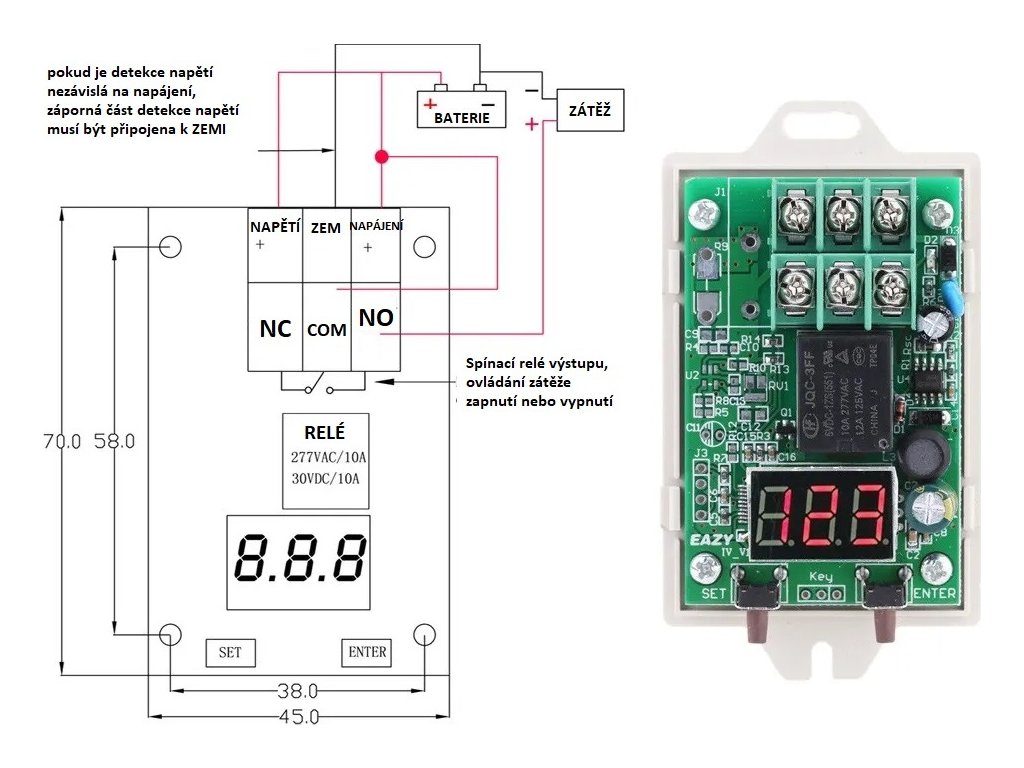 V nastavení je možné určiť spodnú/hornú hranicu napätia, dobu zopnutia displeja, hysteréziu zapínania a spôsob kedy sa bude relé spínať/rozpínať.