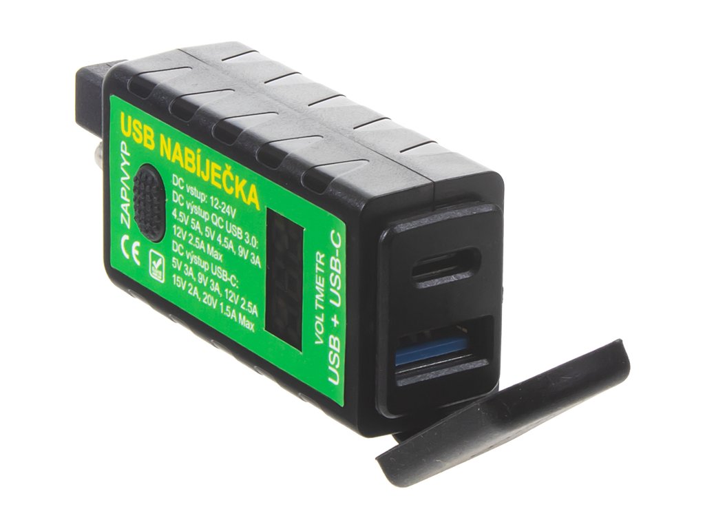 Duálne USB + USBC nabíjačka s voltmetrom a vypínačom pre odopnutie nabíjačky od napätia.