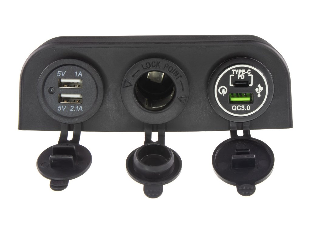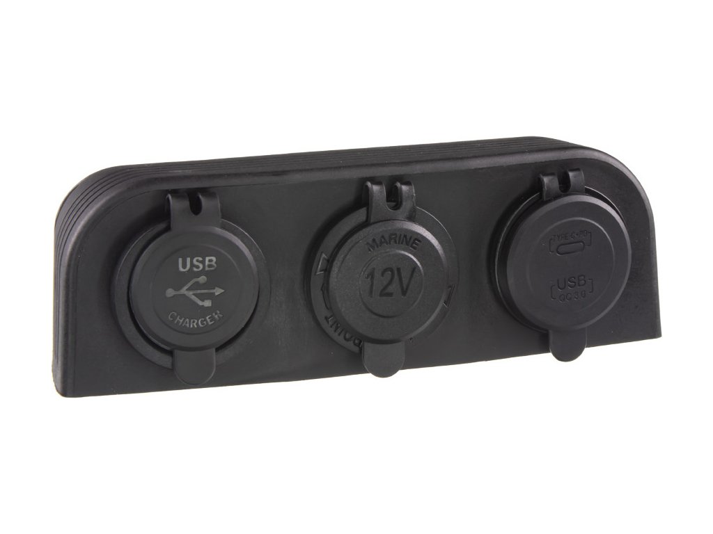 Trojitá zásuvka s panelom pre samostatnú montáž, CL, 2x USB-A (3,1 A) + 1x USB-A (QC3.0) + 1x USB-C (PD) nabíjačka vodeodolná.