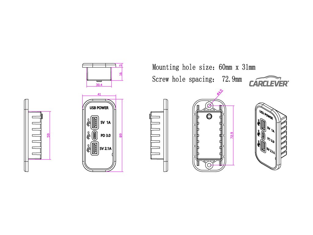 USB 2.4A + QC3.0 + USB-C PD zásuvka 12/24V, chrómový rámček